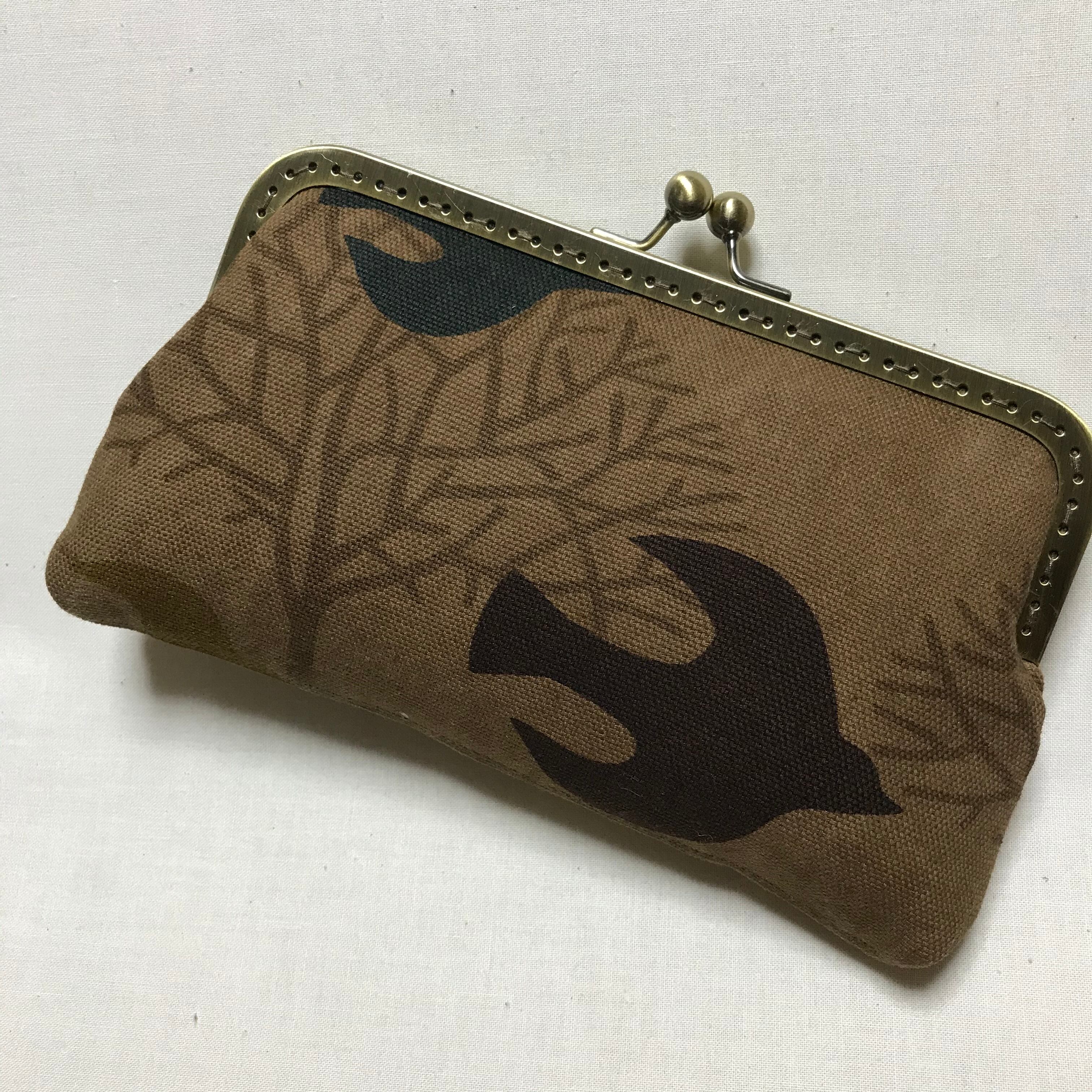 市販のプリント生地を柿渋で染めて作った長財布風の角がま口です。
